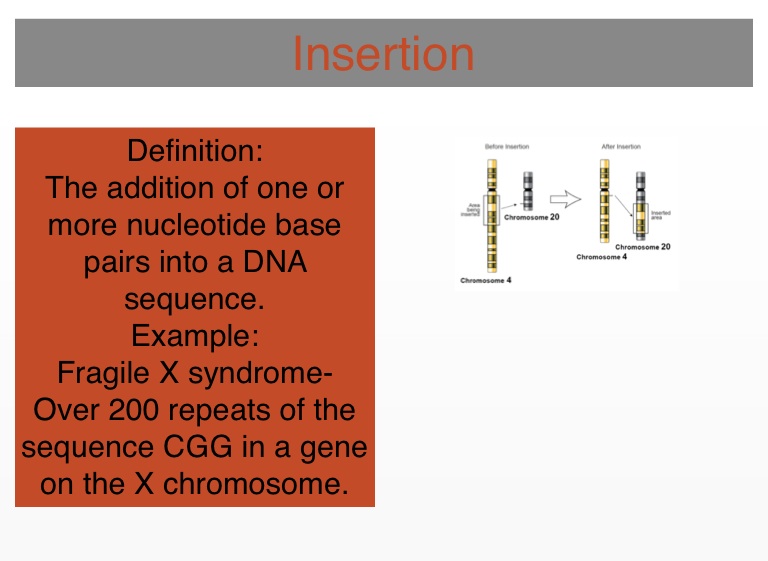 Fragile X syndrome- Over 200 repeats of the sequence CGG in a gene on the X chromosome.