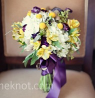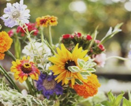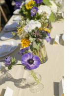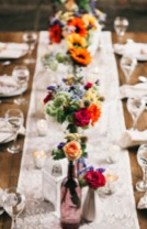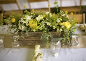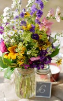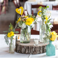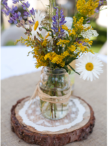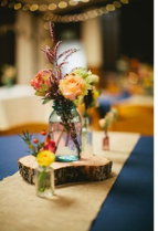 Arrangements will feature a mix of wild florals such as lisianthus, yellow roses, scabiosa and other wild flowers. Garlands of fern, forest foliage with blooms will be displayed on sweets table. Bridal bouquet will be a romantic hand tied bouquet with a wild flower vibe. While bridesmaids bouquets will be hand tied greens and blooms in coordinating tones with burlap ribbons dependent on dress style. Ceremony will be framed by wreathed and a large branch hanging from arbor. Aisle will feature mason jar arrangements hanging down the path.