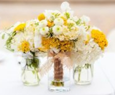 The use of pink, purple and yellow wild flowers in combination with leafy greens and ferns. With elements of
