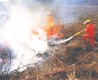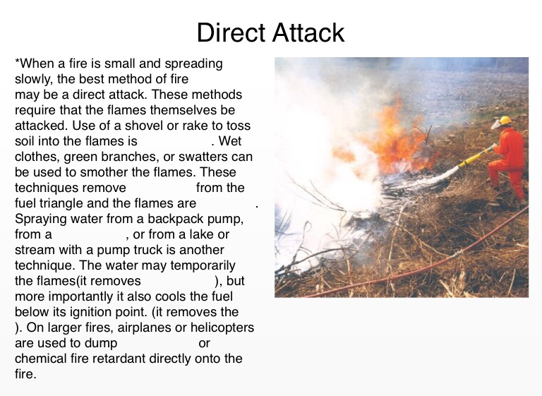*When a fire is small and spreading slowly, the best method of fire may be a direct attack. These methods require that the flames themselves be attacked. Use of a shovel or rake to toss soil into the flames is . Wet clothes, green branches, or swatters can be used to smother the flames. These techniques remove from the fuel triangle and the flames are . Spraying water from a backpack pump, from a , or from a lake or stream with a pump truck is another technique. The water may temporarily the flames(it removes ), but more importantly it also cools the fuel below its ignition point. (it removes the ). On larger fires, airplanes or helicopters are used to dump or chemical fire retardant directly onto the fire.