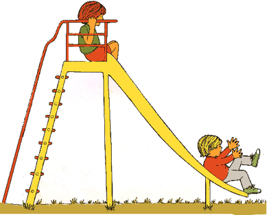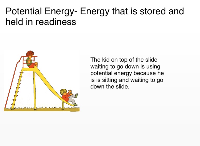 The kid on top of the slide waiting to go down is using potential energy because he is is sitting and waiting to go down the slide.