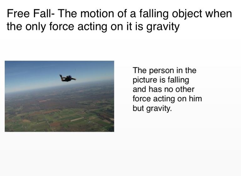 Free Fall- The motion of a falling object when the only force acting on it is gravity