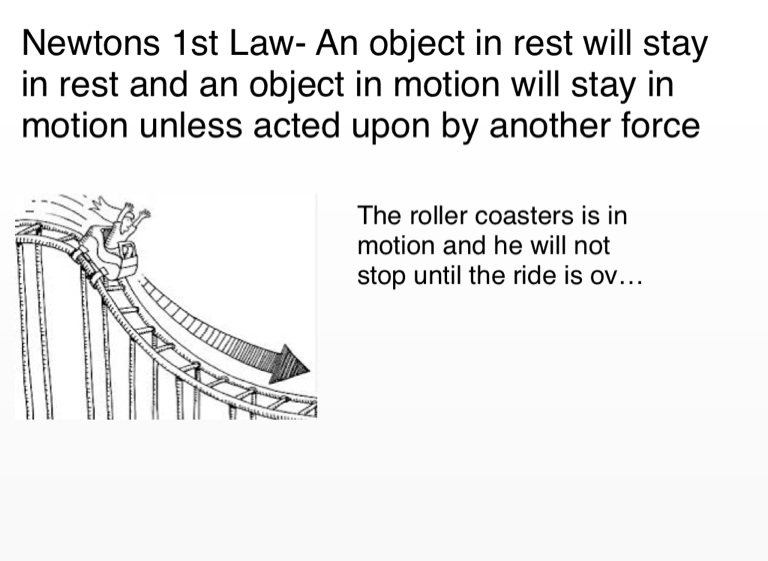 Newtons 1st Law- An object in rest will stay in rest and an object in motion will stay in motion unless acted upon by another force
