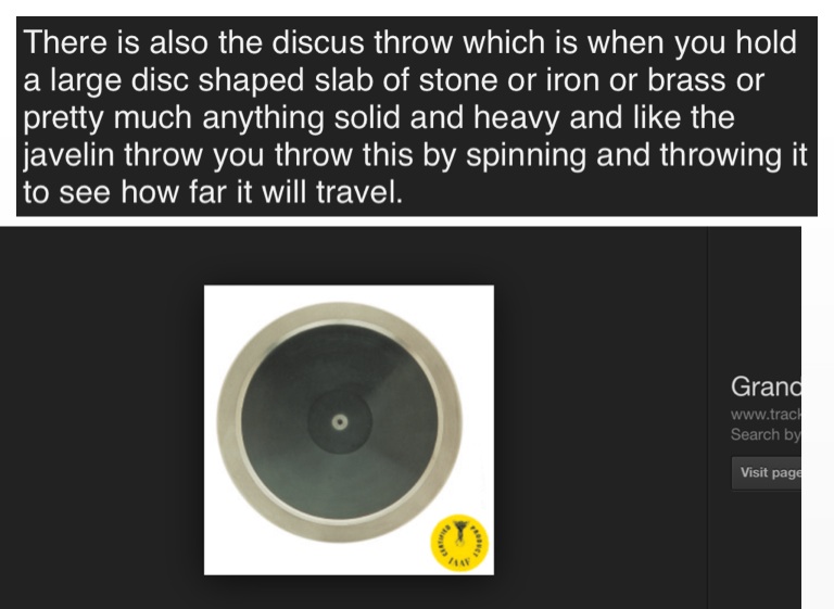 There is also the discus throw which is when you hold a large disc shaped slab of stone or iron or brass or pretty much anything solid and heavy and like the javelin throw you throw this by spinning and throwing it to see how far it will travel.