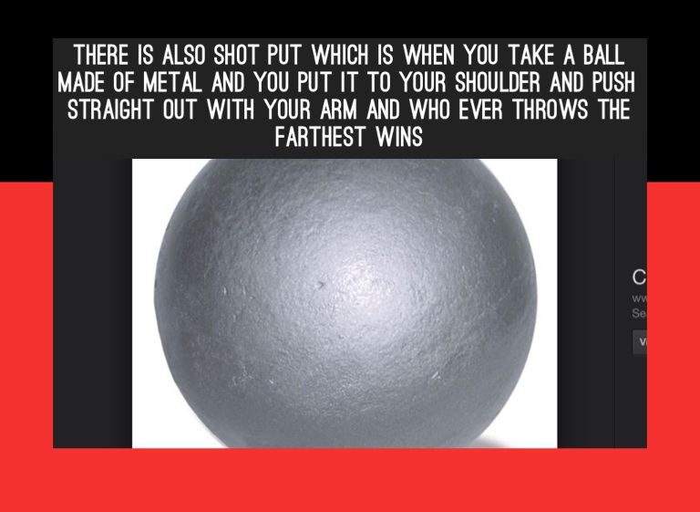 There is also shot put which is when you take a ball made of metal and you put it to your shoulder and push straight out with your arm and who ever throws the farthest wins