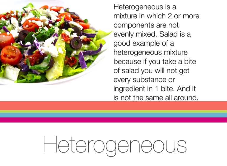 Heterogeneous is a mixture in which 2 or more components are not evenly mixed. Salad is a good example of a heterogeneous mixture because if you take a bite of salad you will not get every substance or ingredient in 1 bite. And it is not the same all around.