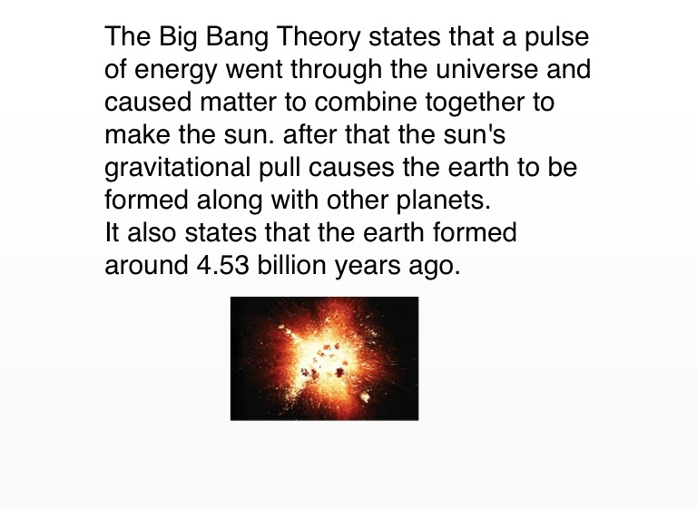 The Big Bang Theory states that a pulse of energy went through the universe and caused matter to combine together to make the sun. after that the sun's gravitational pull causes the earth to be formed along with other planets.