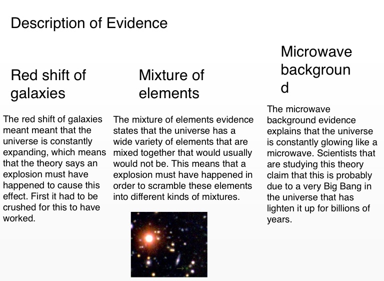 The mixture of elements evidence states that the universe has a wide variety of elements that are mixed together that would usually would not be. This means that a explosion must have happened in order to scramble these elements into different kinds of mixtures.