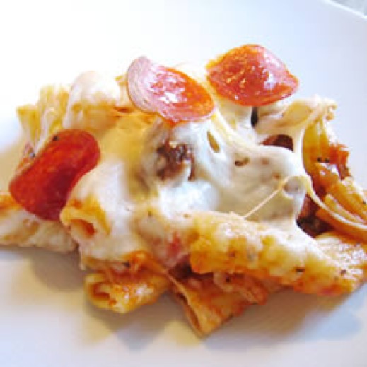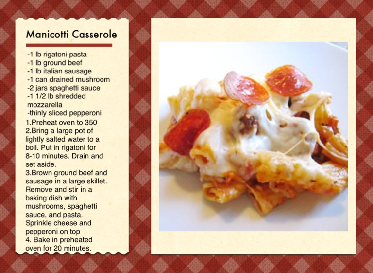 3.Brown ground beef and sausage in a large skillet. Remove and stir in a baking dish with mushrooms, spaghetti sauce, and pasta. Sprinkle cheese and pepperoni on top