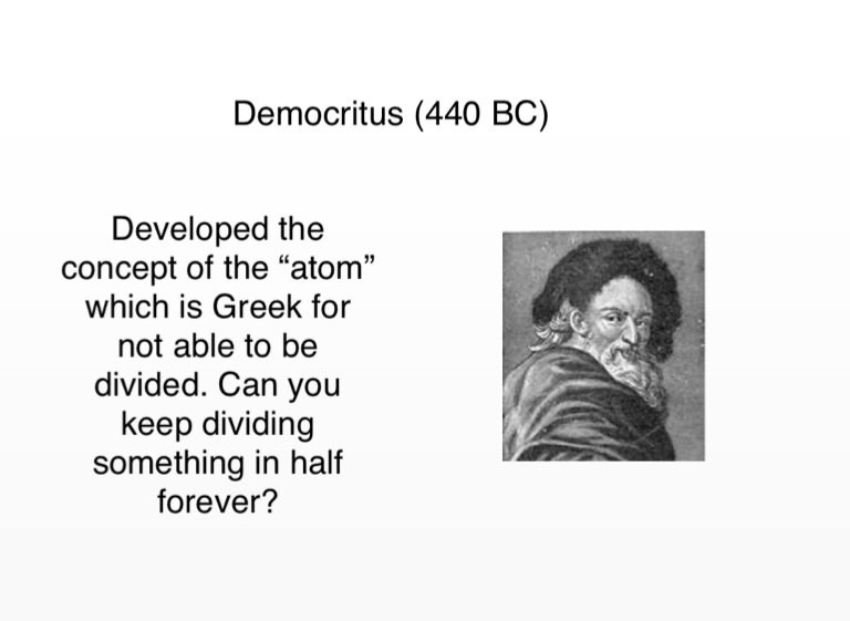 Developed the concept of the “atom” which is Greek for not able to be divided. Can you keep dividing something in half forever?