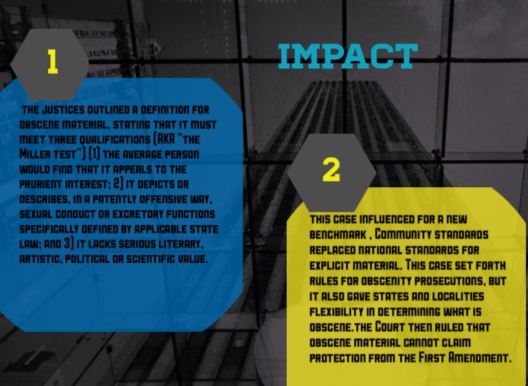 this case influenced for a new benchmark , Community standards replaced national standards for explicit material. This case set forth rules for obscenity prosecutions, but it also gave states and localities flexibility in determining what is obscene.the Court then ruled that obscene material cannot claim protection from the First Amendment.