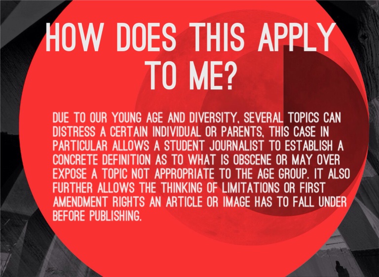 Due to our young age and diversity, several topics can distress a certain individual or parents, this case in particular allows a Student journalist to establish a concrete definition as to what is obscene or may over expose a topic not appropriate to the age group. It also further allows the thinking of Limitations or first amendment rights an article or image has to fall under before publishing.