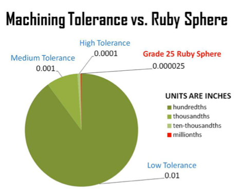 The "sphericity" of the Lambda's Grade 25 ruby is 25 millionths of an inch. Take an inch. Divide it into one million (1,000,000) slices. The amount of error is less than 25 slices…out of a million. The majority of machined parts are manufactured to within about 0.001 inches. I created the chart below to make blowing your mind easier on your brain.