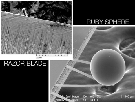 Below is an electron micro-graph that will give you a reasonable comparison between a metal “machined” surface and the surface of an instrument ruby. The image on the left is the ground edge of a razor blade. This is probably a much smoother finish that you will see with machining. However, compared to the surface of a ruby sphere at the same scale, it looks like the Grand Canyon.