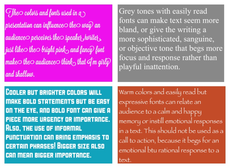 The colors and fonts used in a presentation can influence the way an audience perceives the speaker/writer, just like the bright pink and fancy font make the audience think that I'm girly and shallow.