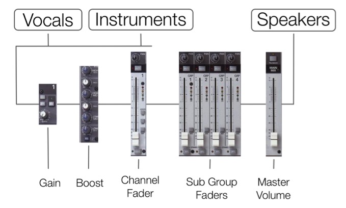 Here is a very basic flow chart of how the volume / decibel level is controlled by the audio person for your site.