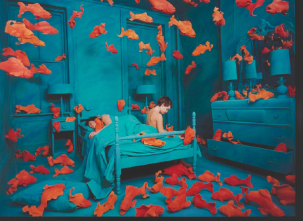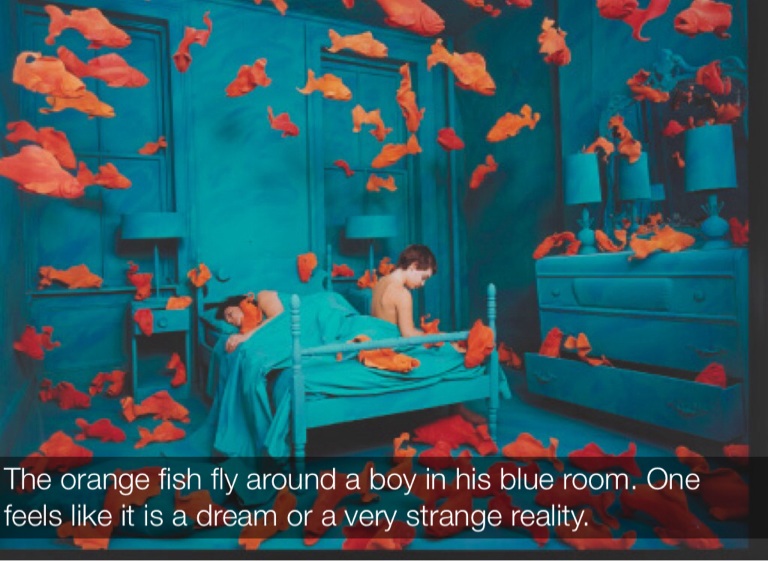The orange fish fly around a boy in his blue room. One feels like it is a dream or a very strange reality.