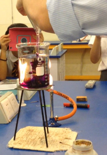 First, we put in the crystals into the beaker through a funnel (it was solid at first). Then we turned on the Bunsen burner to heat up the water and make the crystals dissolve inside the water as seen in the picture to the left.