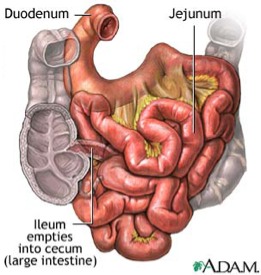 I am in the Duodenum, and Bile is bolting at me. It's coming from the Liver which I just passed. I see the Gall Bladder and all of its Bile that is stores. The pancreas is right next to me, and all of the hormonic insulin is going into the blood stream. Ahhh! There's so many twists and turns now; I'm in the Jejunum. There's a lot of villi absorbing the nutrients out of me! Now, I'm in the last part of the Small Intestine, the Ileum.