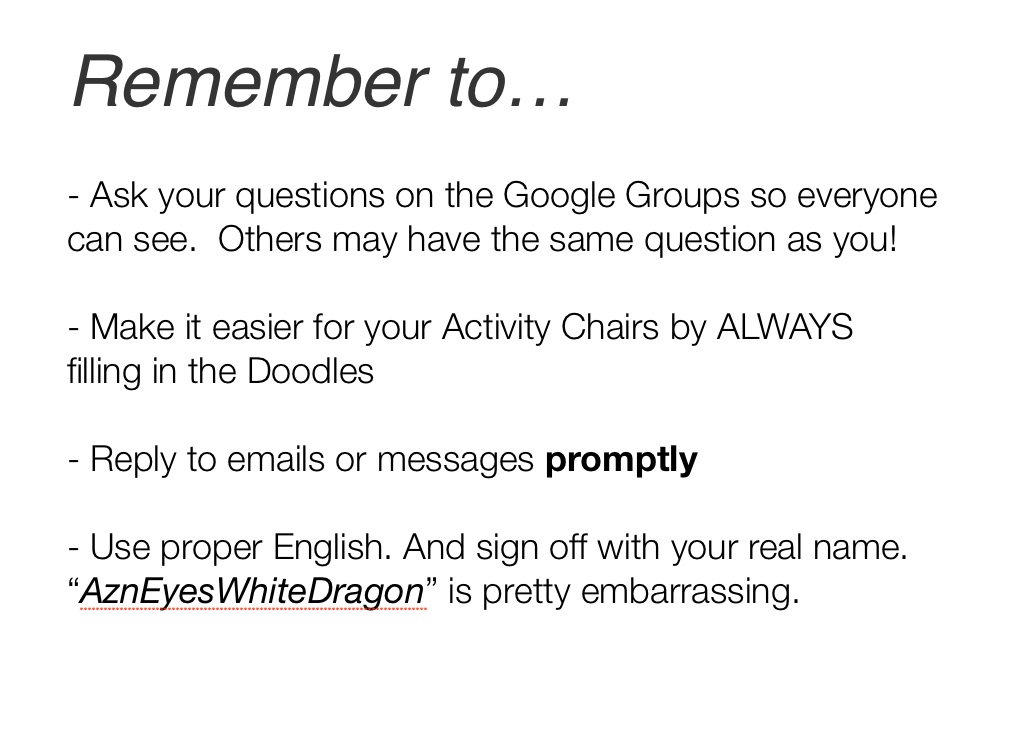 - Use proper English. And sign off with your real name. “AznEyesWhiteDragon” is pretty embarrassing.