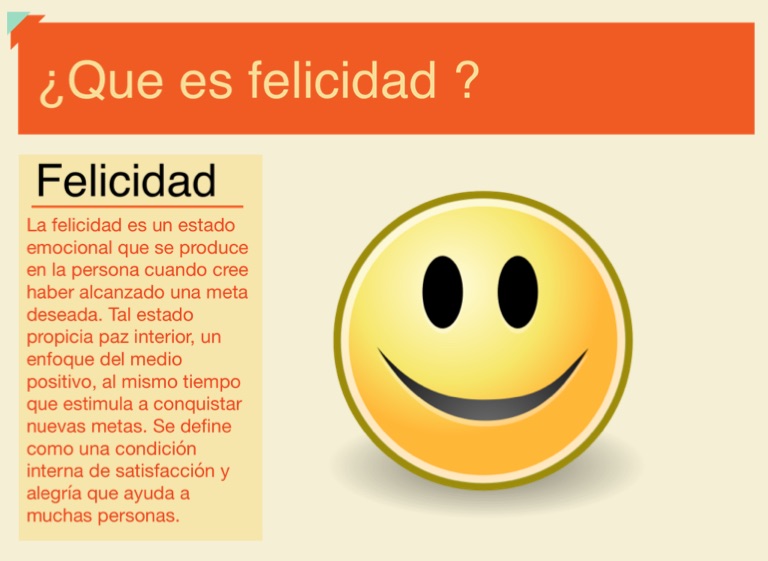 La felicidad es un estado emocional que se produce en la persona cuando cree haber alcanzado una meta deseada. Tal estado propicia paz interior, un enfoque del medio positivo, al mismo tiempo que estimula a conquistar nuevas metas. Se define como una condición interna de satisfacción y alegría que ayuda a muchas personas.