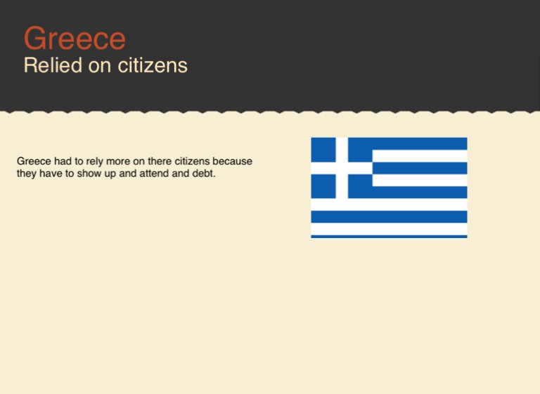 Greece had to rely more on there citizens because they have to show up and attend and debt.