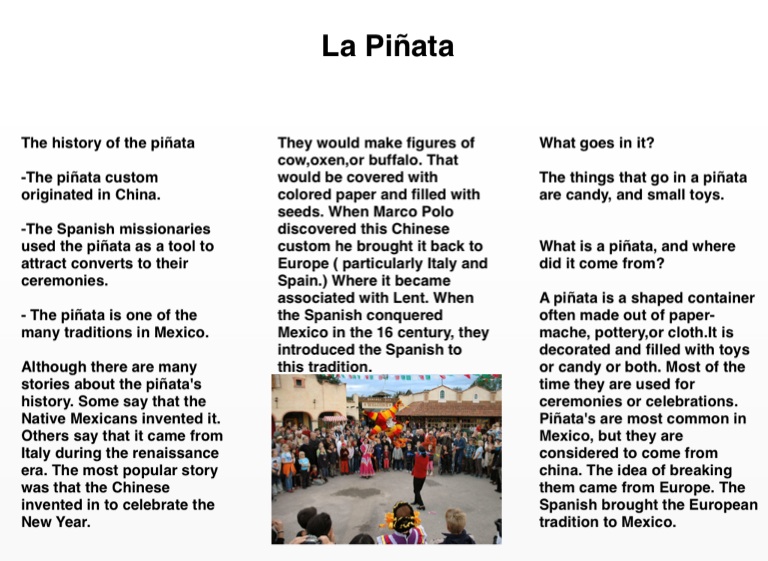 They would make figures of cow,oxen,or buffalo. That would be covered with colored paper and filled with seeds. When Marco Polo discovered this Chinese custom he brought it back to Europe ( particularly Italy and Spain.) Where it became associated with Lent. When the Spanish conquered Mexico in the 16 century, they introduced the Spanish to this tradition.