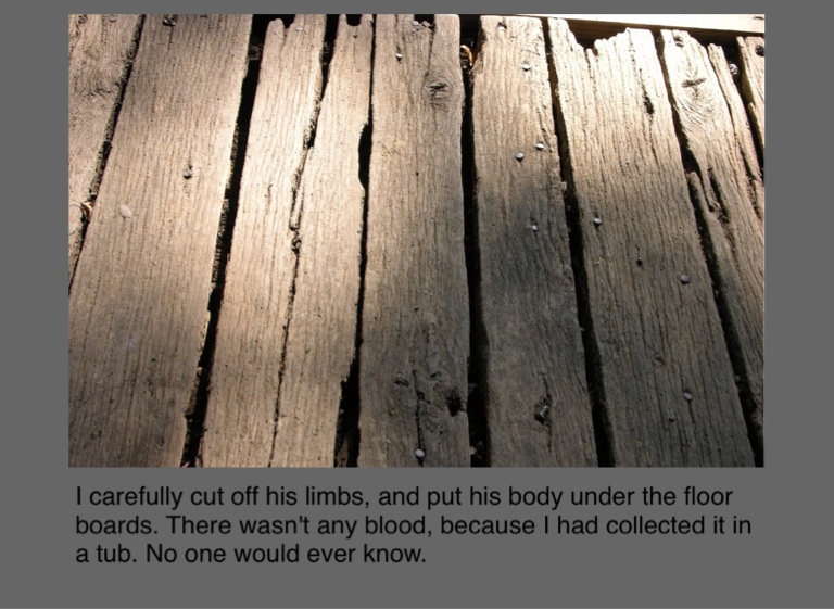 I carefully cut off his limbs, and put his body under the floor boards. There wasn't any blood, because I had collected it in a tub. No one would ever know.