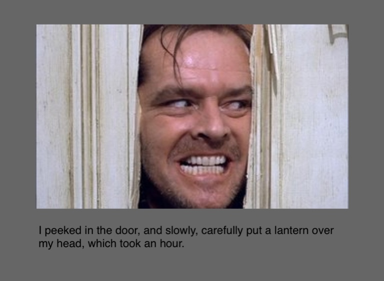 I peeked in the door, and slowly, carefully put a lantern over my head, which took an hour.