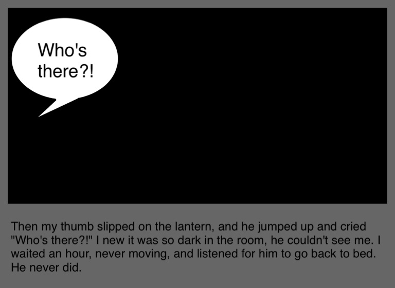 Then my thumb slipped on the lantern, and he jumped up and cried "Who's there?!" I new it was so dark in the room, he couldn't see me. I waited an hour, never moving, and listened for him to go back to bed. He never did.