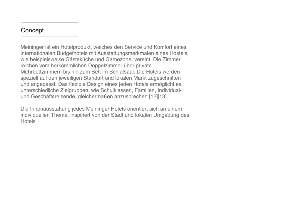 Meininger ist ein Hotelprodukt, welches den Service und Komfort eines internationalen Budgethotels mit Ausstattungsmerkmalen eines Hostels, wie beispielsweise Gästeküche und Gamezone, vereint. Die Zimmer reichen vom herkömmlichen Doppelzimmer über private Mehrbettzimmern bis hin zum Bett im Schlafsaal. Die Hotels werden speziell auf den jeweiligen Standort und lokalen Markt zugeschnitten und angepasst. Das flexible Design eines jeden Hotels ermöglicht es, unterschiedliche Zielgruppen, wie Schulklassen, Familien, Individual- und Geschäftsreisende, gleichermaßen anzusprechen.[12][13]