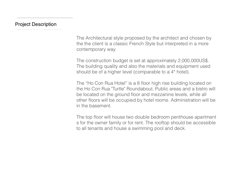 The “Ho Con Rua Hotel” is a 8 floor high rise building located on the Ho Con Rua "Turtle" Roundabout. Public areas and a bistro will be located on the ground floor and mezzanine levels, while all other floors will be occupied by hotel rooms. Administration will be in the basement.