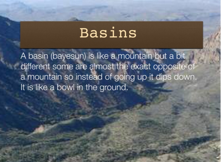 A basin (bayesun) is like a mountain but a bit different some are almost the exact opposite of a mountain so instead of going up it dips down. It is like a bowl in the ground.
