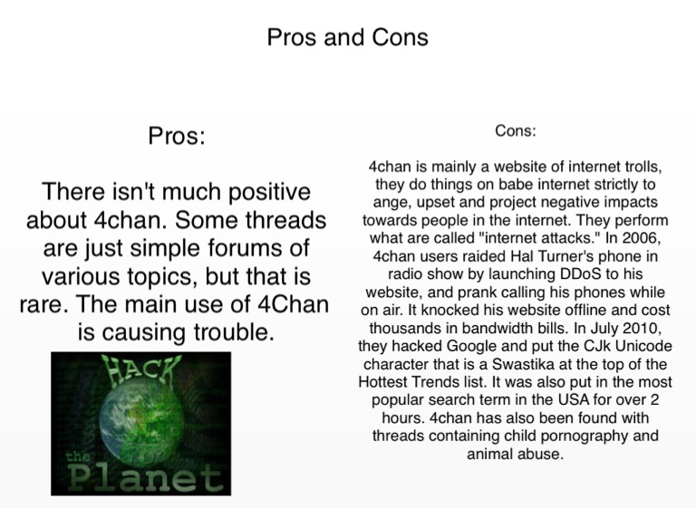 4chan is mainly a website of internet trolls, they do things on babe internet strictly to ange, upset and project negative impacts towards people in the internet. They perform what are called "internet attacks." In 2006, 4chan users raided Hal Turner's phone in radio show by launching DDoS to his website, and prank calling his phones while on air. It knocked his website offline and cost thousands in bandwidth bills. In July 2010, they hacked Google and put the CJk Unicode character that is a Swastika at the top of the Hottest Trends list. It was also put in the most popular search term in the USA for over 2 hours. 4chan has also been found with threads containing child pornography and animal abuse.