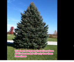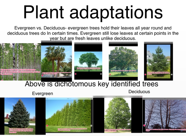 Evergreen vs. Deciduous- evergreen trees hold their leaves all year round and deciduous trees do In certain times. Evergreen still lose leaves at certain points in the year but are fresh leaves unlike deciduous.