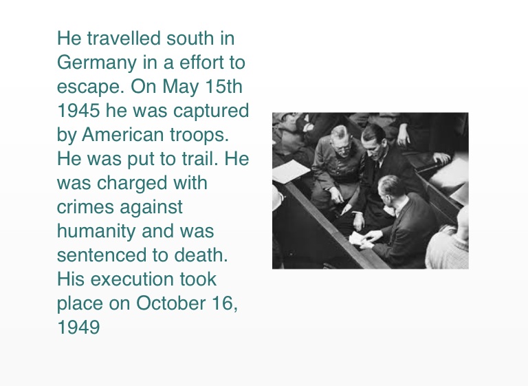 He travelled south in Germany in a effort to escape. On May 15th 1945 he was captured by American troops. He was put to trail. He was charged with crimes against humanity and was sentenced to death. His execution took place on October 16, 1949