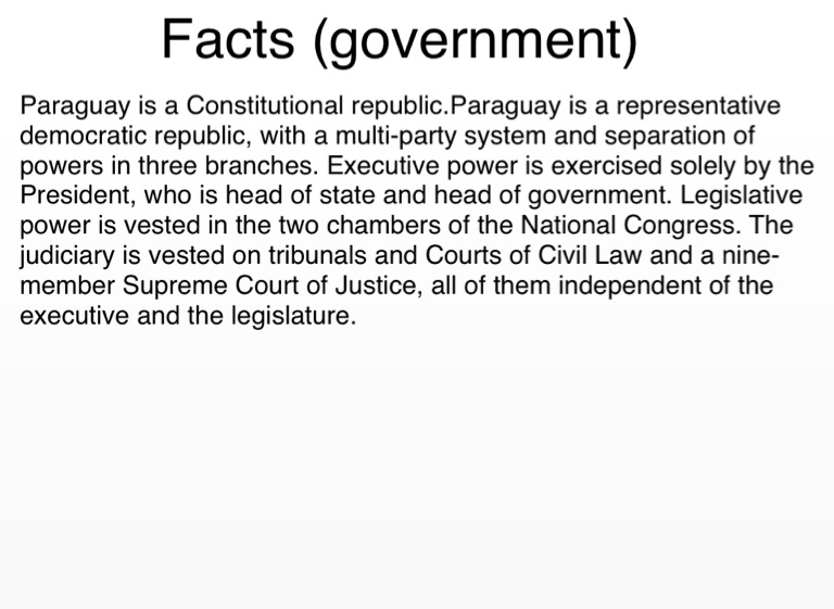 Paraguay is a Constitutional republic.Paraguay is a representative democratic republic, with a multi-party system and separation of powers in three branches. Executive power is exercised solely by the President, who is head of state and head of government. Legislative power is vested in the two chambers of the National Congress. The judiciary is vested on tribunals and Courts of Civil Law and a nine-member Supreme Court of Justice, all of them independent of the executive and the legislature.