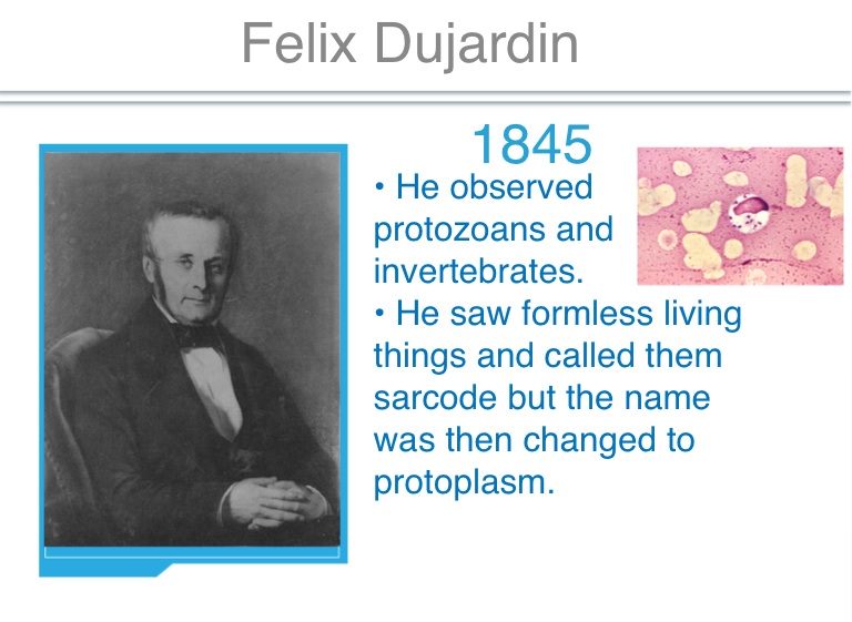 • He saw formless living things and called them sarcode but the name was then changed to protoplasm.