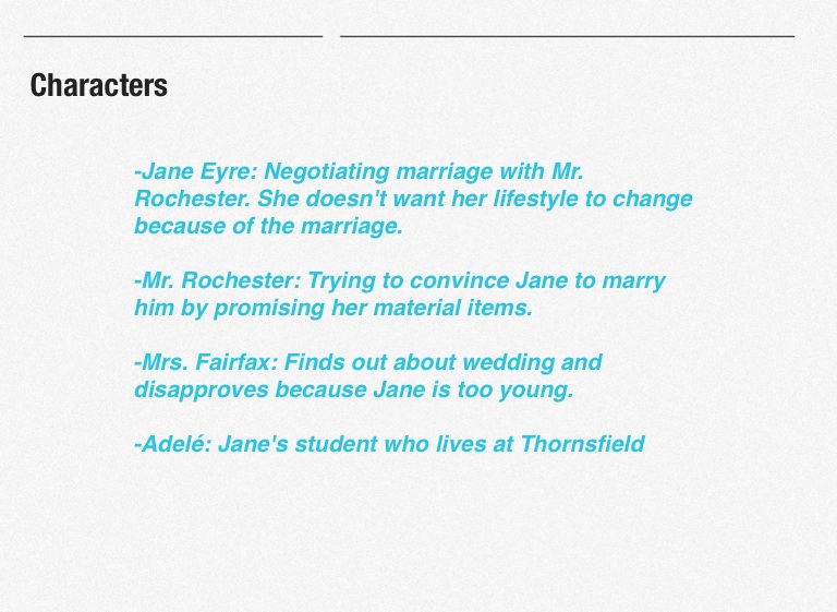 -Jane Eyre: Negotiating marriage with Mr. Rochester. She doesn't want her lifestyle to change because of the marriage.