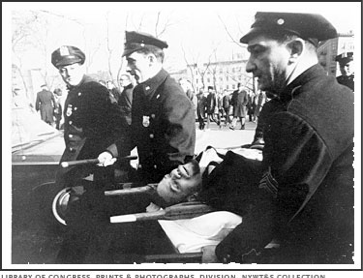 Malcolm X on stretcher carried by New York policemen following his assassination at rally, 1965.