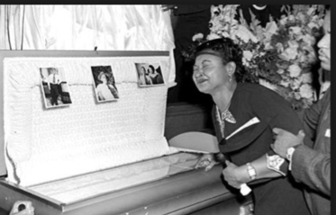 Emmet Till's mother standing by Emmet's open casket at his funeral. She was full of emotion throughout this time.