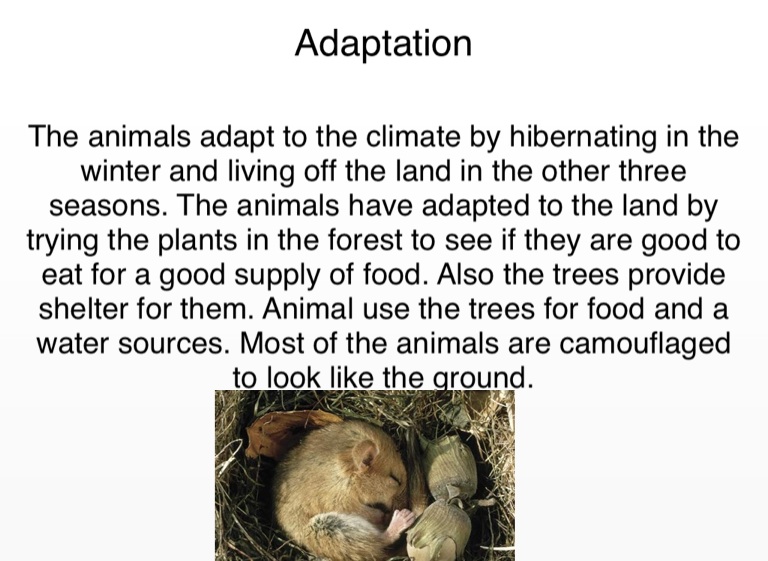 The animals adapt to the climate by hibernating in the winter and living off the land in the other three seasons. The animals have adapted to the land by trying the plants in the forest to see if they are good to eat for a good supply of food. Also the trees provide shelter for them. Animal use the trees for food and a water sources. Most of the animals are camouflaged to look like the ground.
