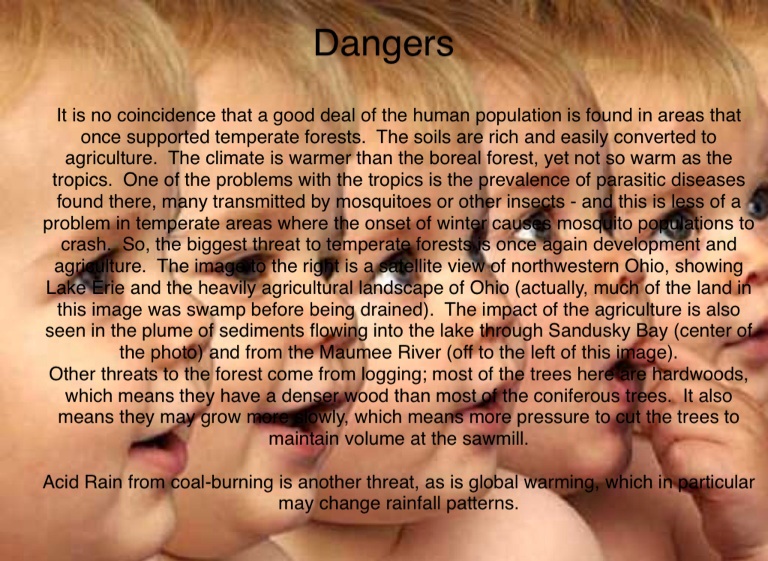 It is no coincidence that a good deal of the human population is found in areas that once supported temperate forests. The soils are rich and easily converted to agriculture. The climate is warmer than the boreal forest, yet not so warm as the tropics. One of the problems with the tropics is the prevalence of parasitic diseases found there, many transmitted by mosquitoes or other insects - and this is less of a problem in temperate areas where the onset of winter causes mosquito populations to crash. So, the biggest threat to temperate forests is once again development and agriculture. The image to the right is a satellite view of northwestern Ohio, showing Lake Erie and the heavily agricultural landscape of Ohio (actually, much of the land in this image was swamp before being drained). The impact of the agriculture is also seen in the plume of sediments flowing into the lake through Sandusky Bay (center of the photo) and from the Maumee River (off to the left of this image).