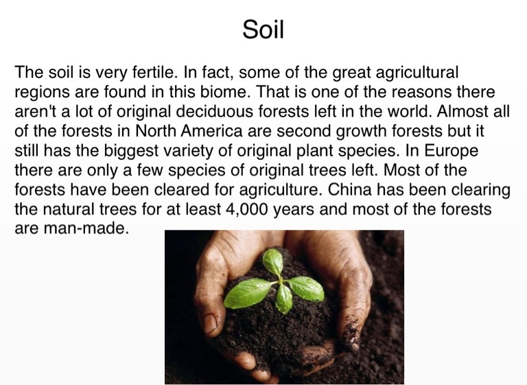 The soil is very fertile. In fact, some of the great agricultural regions are found in this biome. That is one of the reasons there aren't a lot of original deciduous forests left in the world. Almost all of the forests in North America are second growth forests but it still has the biggest variety of original plant species. In Europe there are only a few species of original trees left. Most of the forests have been cleared for agriculture. China has been clearing the natural trees for at least 4,000 years and most of the forests are man-made.