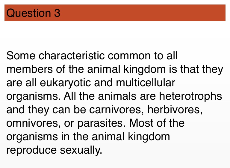 Some characteristic common to all members of the animal kingdom is that they are all eukaryotic and multicellular organisms. All the animals are heterotrophs and they can be carnivores, herbivores, omnivores, or parasites. Most of the organisms in the animal kingdom reproduce sexually.
