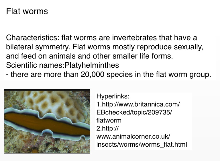 Characteristics: flat worms are invertebrates that have a bilateral symmetry. Flat worms mostly reproduce sexually, and feed on animals and other smaller life forms.