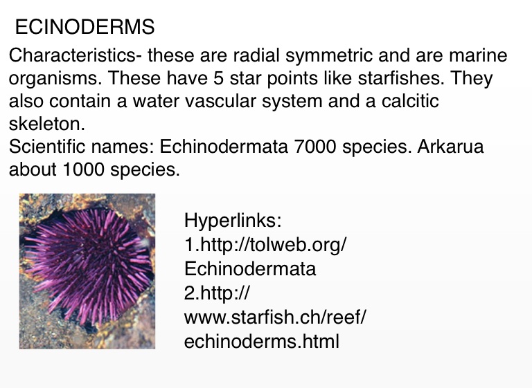 Characteristics- these are radial symmetric and are marine organisms. These have 5 star points like starfishes. They also contain a water vascular system and a calcitic skeleton.