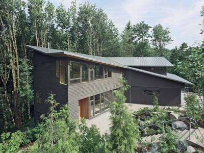 The landscaping around the house keeps the natural growing plants. see how the staircase along the path has nature surrounding it by large rocks and bushes that are common in a forest area.