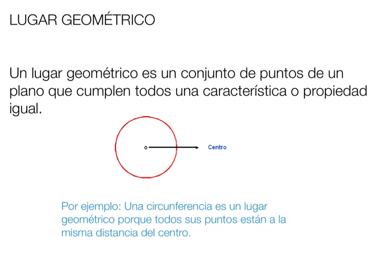 Por ejemplo: Una circunferencia es un lugar geométrico porque todos sus puntos están a la misma distancia del centro.