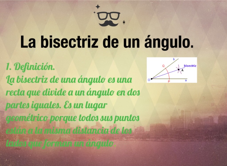 La bisectriz de una ángulo es una recta que divide a un ángulo en dos partes iguales. Es un lugar geométrico porque todos sus puntos están a la misma distancia de los lados que forman un ángulo.